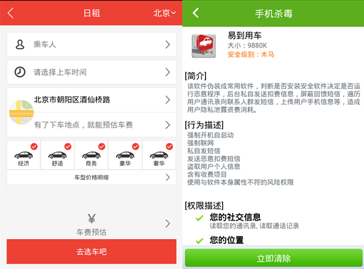 360手机安全专家介绍,“黑专车”木马无论从页面布局、字体还是客户端更新内容,都与正版易到用车相似度极高。如此高仿的目的就是诱骗手机用户安装使用,之后长期潜伏进手机,在后台私自发送扣费信息,同时屏蔽运营商发来的扣费短信通知,使中招手机用户在不知不觉中损失成百上千元的话费。