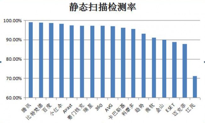 在本次静态扫描测试中,国内外杀毒软件得分基本持平,腾讯电脑管家11以99.18%的检测率名列第一,比特梵德Bitdefender Internet Security 2016和百度杀毒分别以98.88%和98.62%的得分分列第二和第三名。