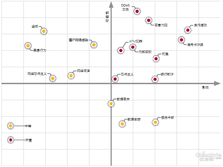 图2-1显示了对俄罗斯所有主要的网络威胁一个近似的评估,依照每种威胁发生的可能性和潜在的影响进行排列。尽管对于某些类型进行公平可靠的统计是可行的,但是并不一定对其他类型也同样适用。因此,部分网络威胁类型的评估是不精确的,而是借鉴了其他多重的可靠数据、独立事件信息和iDefense的实地研究得来的。