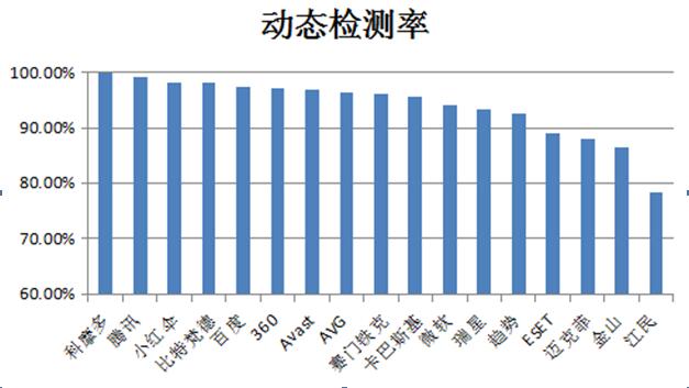 在本次静态扫描测试中,国内外杀毒软件得分基本持平,腾讯电脑管家11以99.18%的检测率名列第一,比特梵德Bitdefender Internet Security 2016和百度杀毒分别以98.88%和98.62%的得分分列第二和第三名。